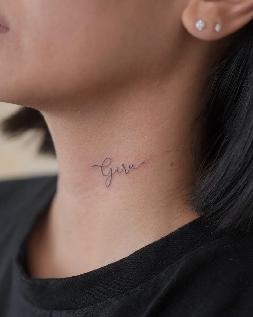This minimalistic neck tattoo showcases the name “Garu” written in elegant, flowing cursive. Positioned just below the ear and along the jawline, it’s subtle yet deeply personal.