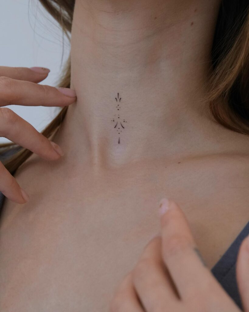 This subtle and elegant neck tattoo features a minimalist ornamental design placed at the center of the throat. Composed of tiny lines and dots, the symmetrical pattern feels both delicate and intentional.
