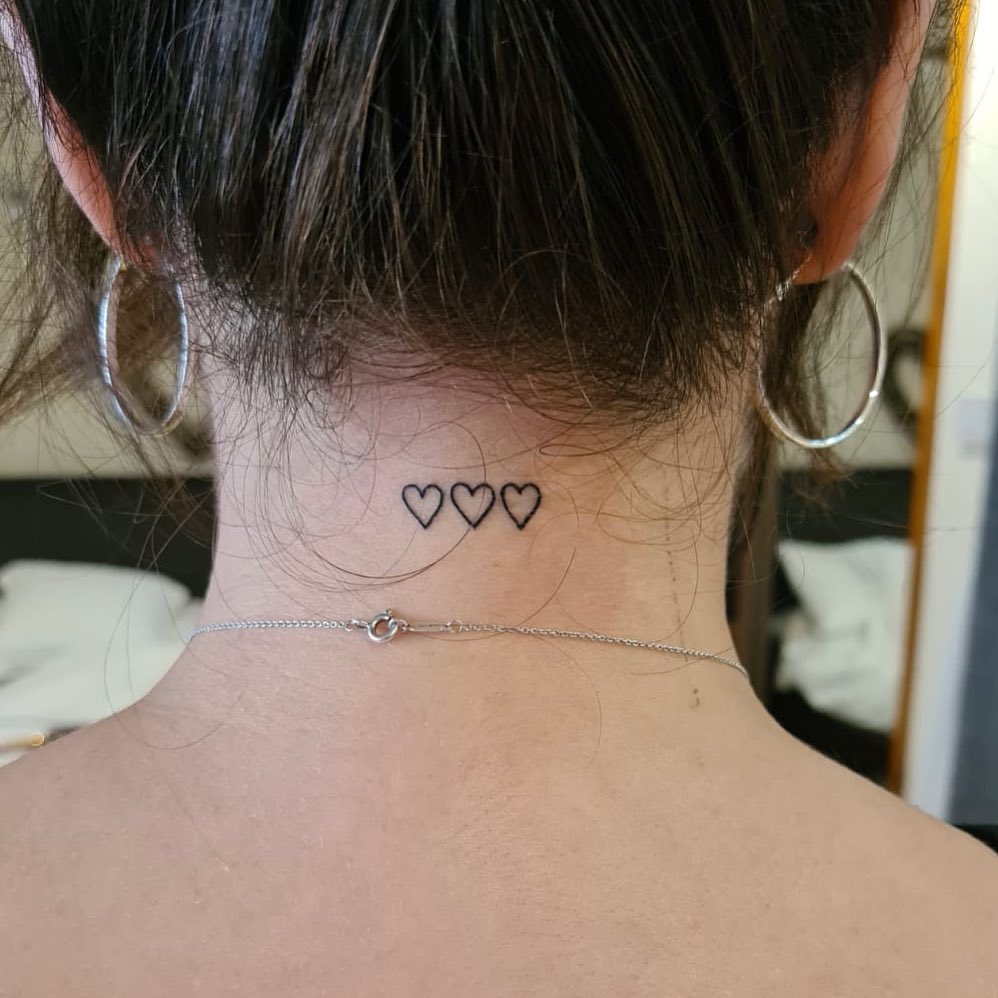 This simple and sweet tattoo features three small black-outlined hearts in a neat row at the back of the neck. It’s a minimalist design that holds space for personal meaning—each heart could represent a loved one, a memory, or a chapter in life.