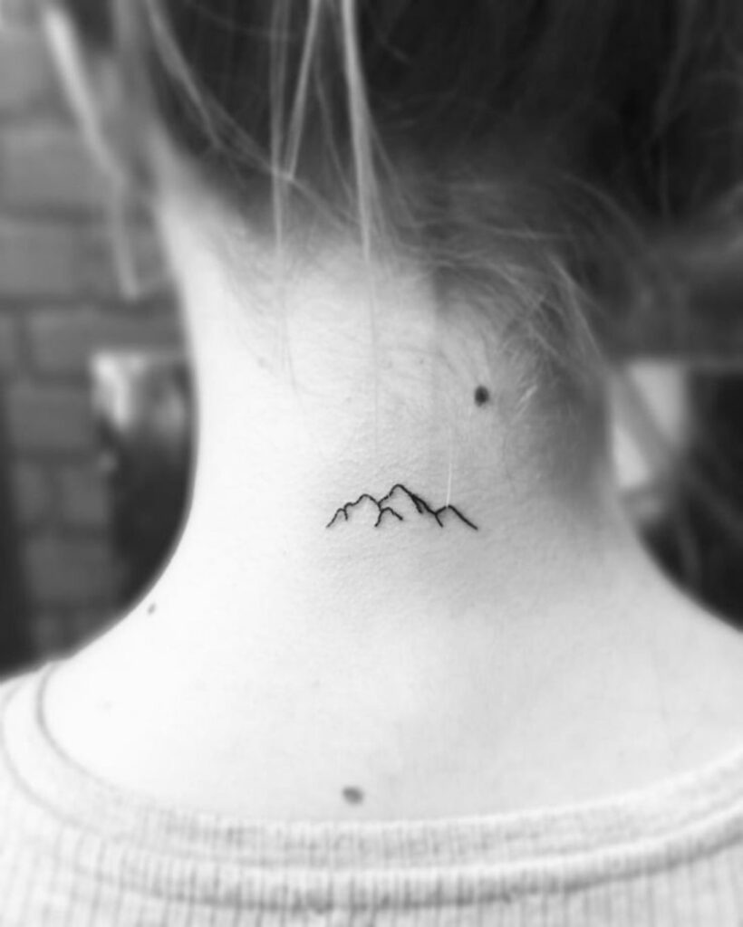 This delicate tattoo showcases a minimalist mountain range drawn with simple black linework. Placed at the center of the upper neck, it offers a quiet reminder of strength, stability, and the beauty of nature.
