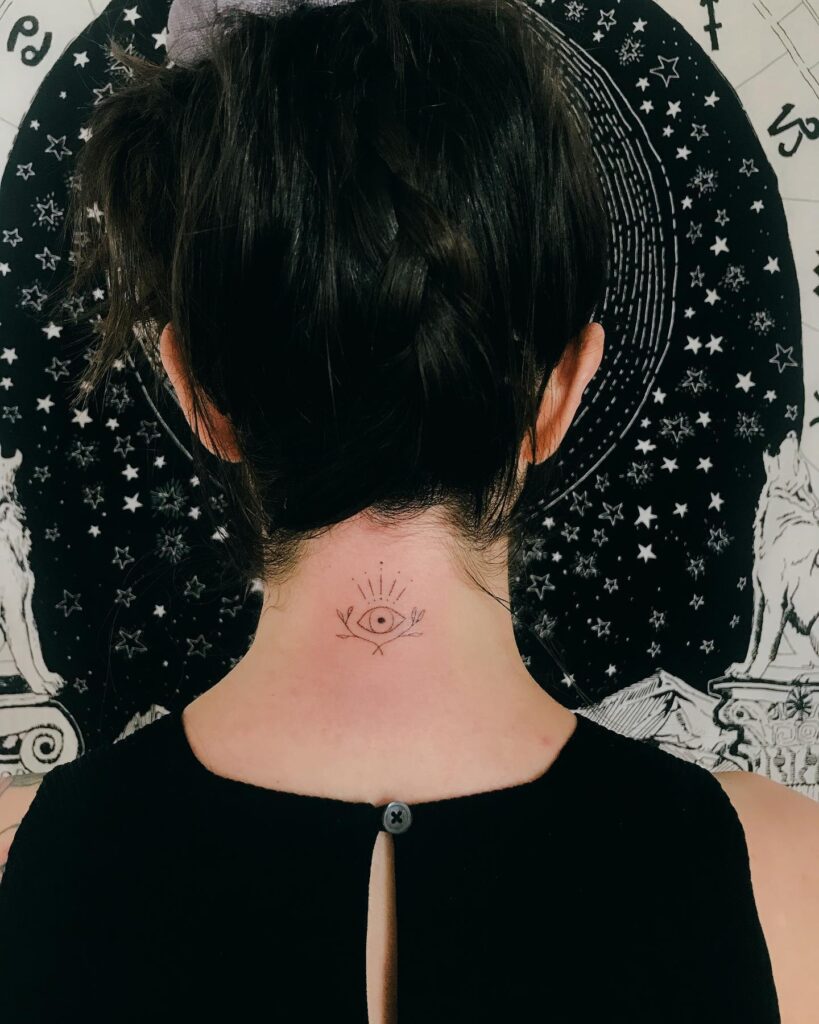 This minimalist tattoo features an all-seeing eye centered at the back of the neck, surrounded by tiny radiating lines and leafy branches. The design blends spiritual symbolism with artistic elegance, representing intuition, protection, and awareness.