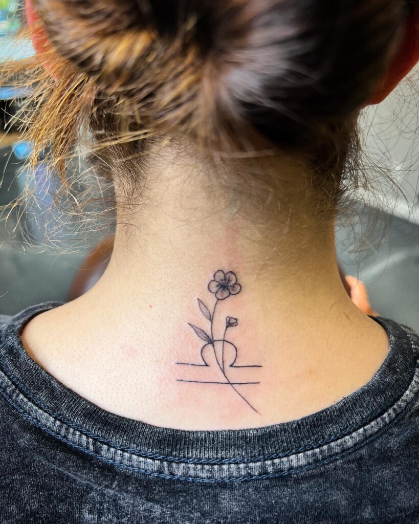 This delicate tattoo combines the Libra zodiac symbol with a dainty wildflower sprouting from it, forming a charming and unique composition. Placed at the center of the upper neck, the fine lines and minimal style give it a graceful, feminine touch.