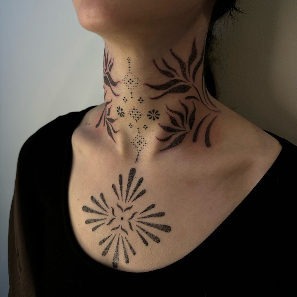 This beautiful neck tattoo features layered mandala-inspired patterns, paired with symmetrical dotted detailing and radiant bursts that resemble celestial energy. It draws the eye upward along the throat, creating a sense of elevation and balance.