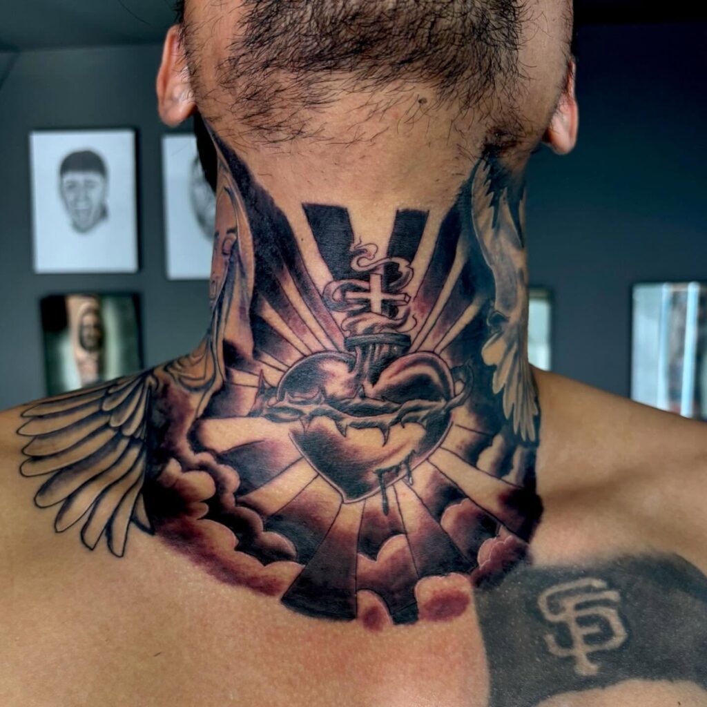 This bold and symbolic neck tattoo features the Sacred Heart, glowing with radiant beams and surrounded by clouds and angel wings. A crown of thorns wraps tightly around the heart, while a cross rises from the top, representing deep faith and sacrifice.
