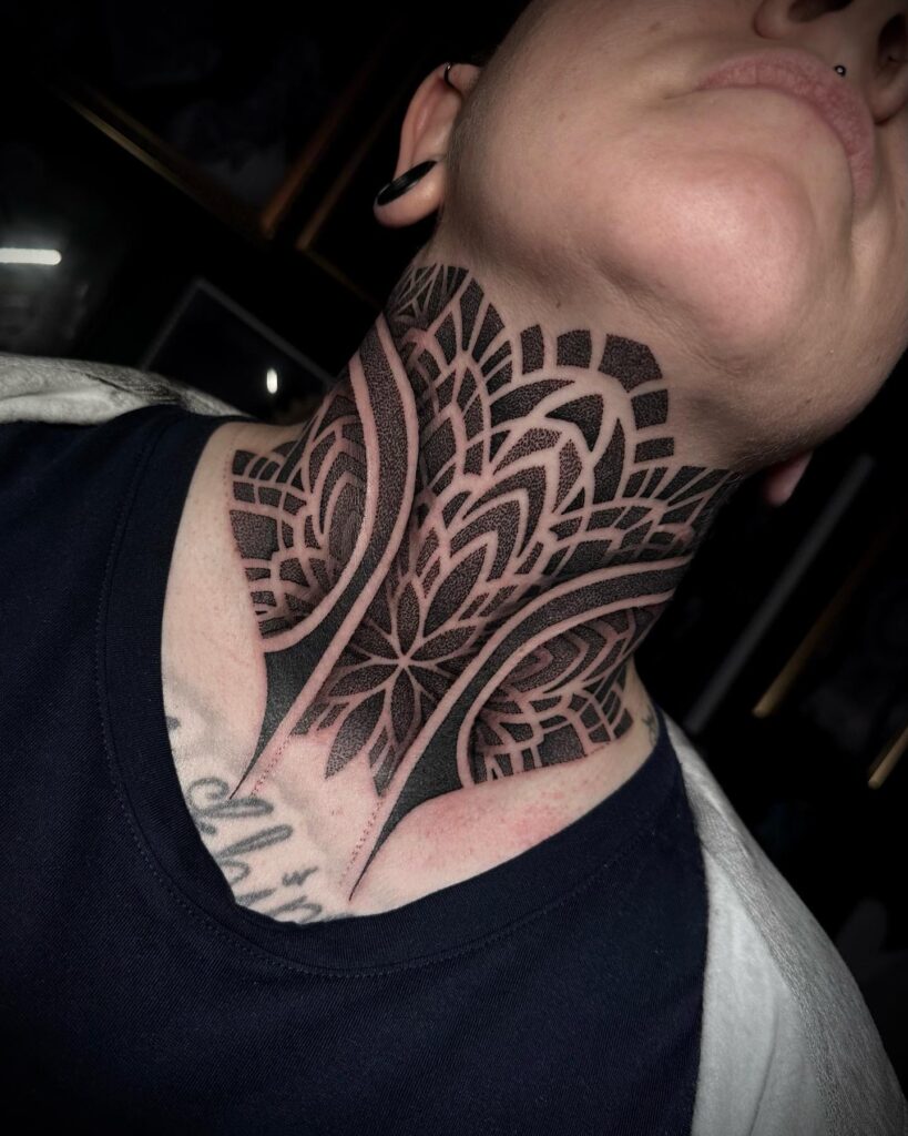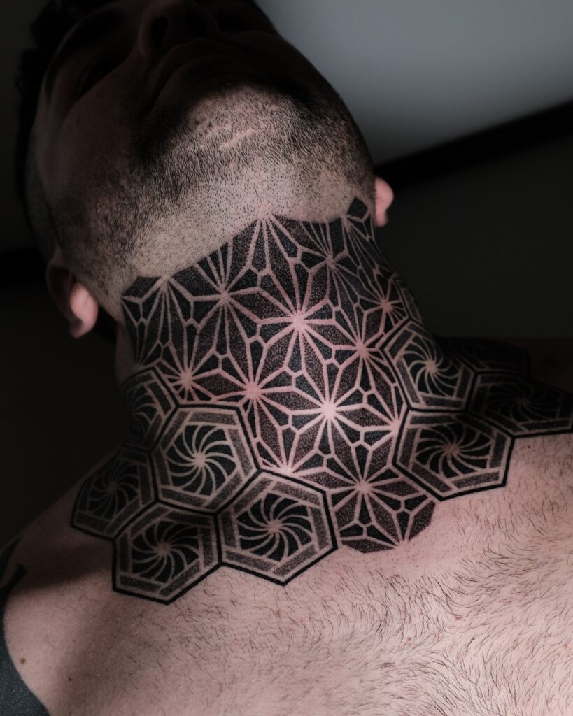 This mesmerizing neck tattoo features intricate geometric patterns that blend symmetry, precision, and artistry. With star-like shapes and spiraling hexagons, the design forms a seamless flow from the chest up to the throat.