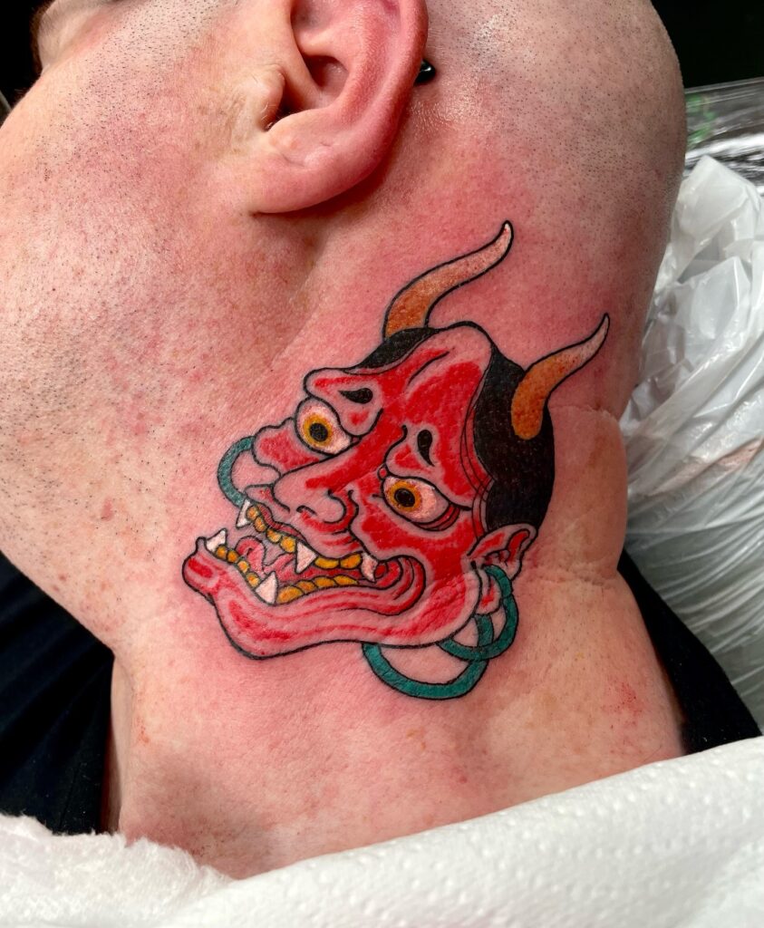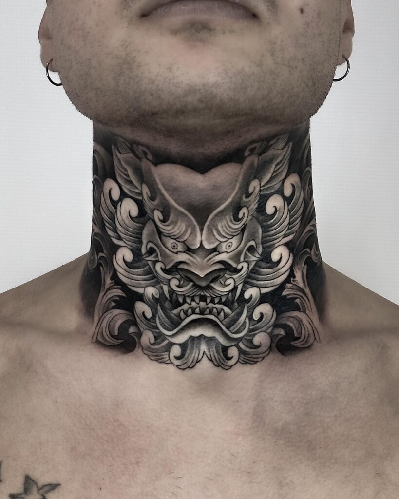 This striking neck tattoo features a traditional Oni mask, a powerful figure in Japanese folklore known for its fearsome appearance and protective spirit. The bold black and grey shading creates incredible depth, while the swirling background elements enhance the flow and intensity of the design.