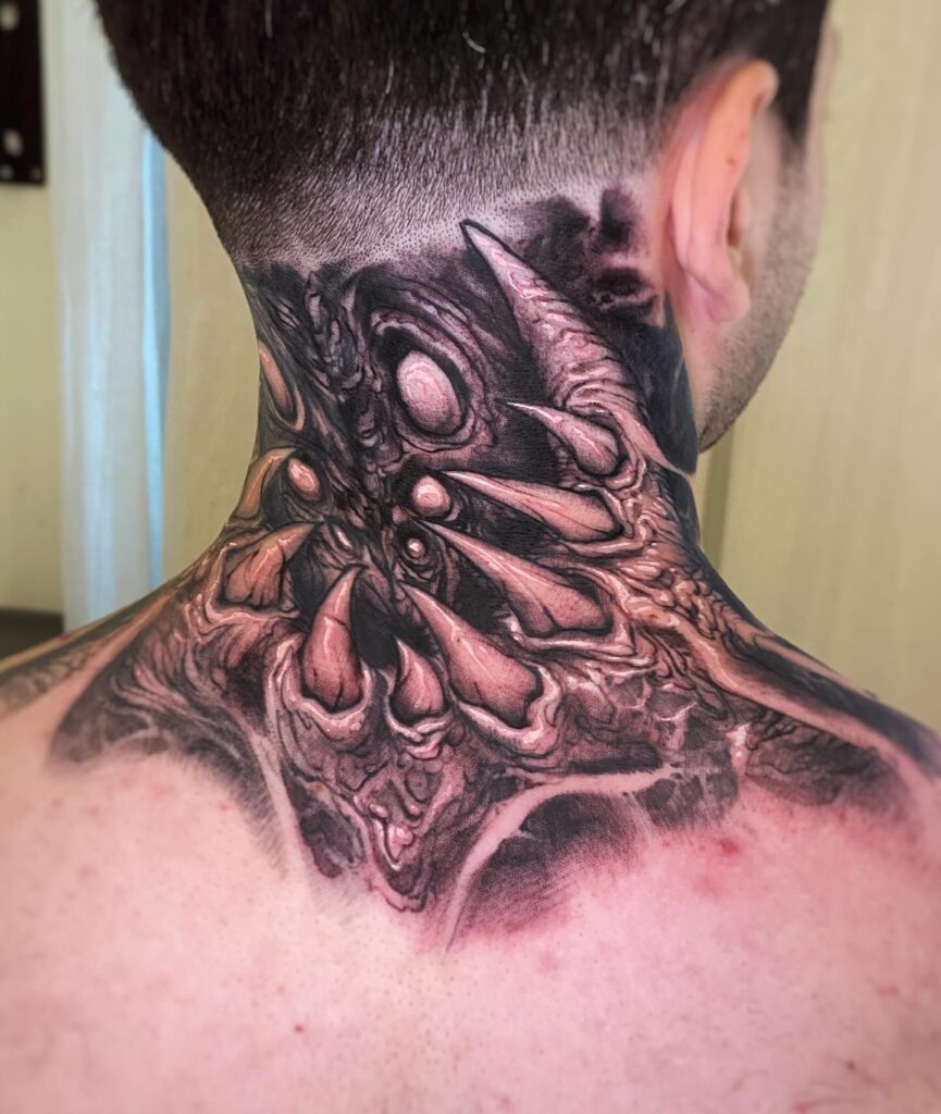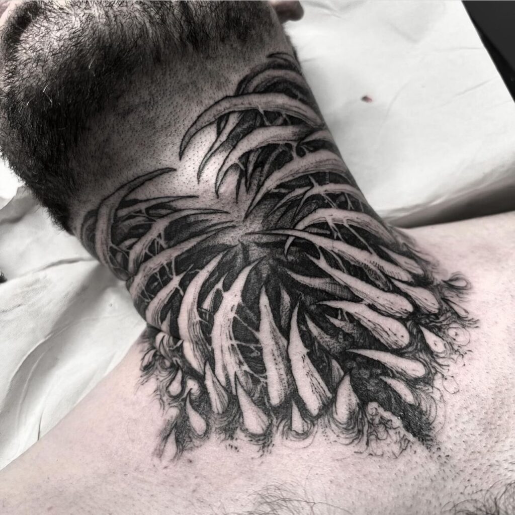 This gnarly neck and chest tattoo looks like something ripped from a dark fantasy or horror realm. Twisted, fleshy ridges and claw-like spines stack and coil up the throat, giving the illusion of a monstrous form erupting from beneath the skin.