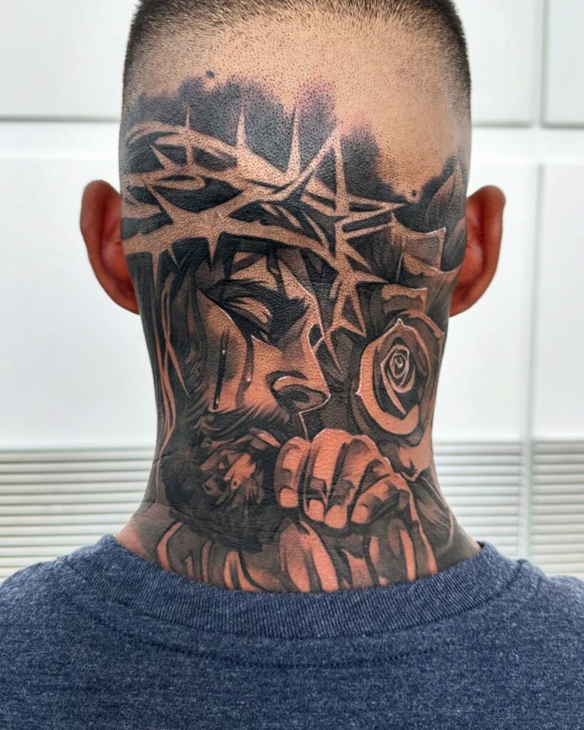 This powerful neck tattoo features the face of Jesus wearing a crown of thorns, his eyes closed in sorrow and prayer.