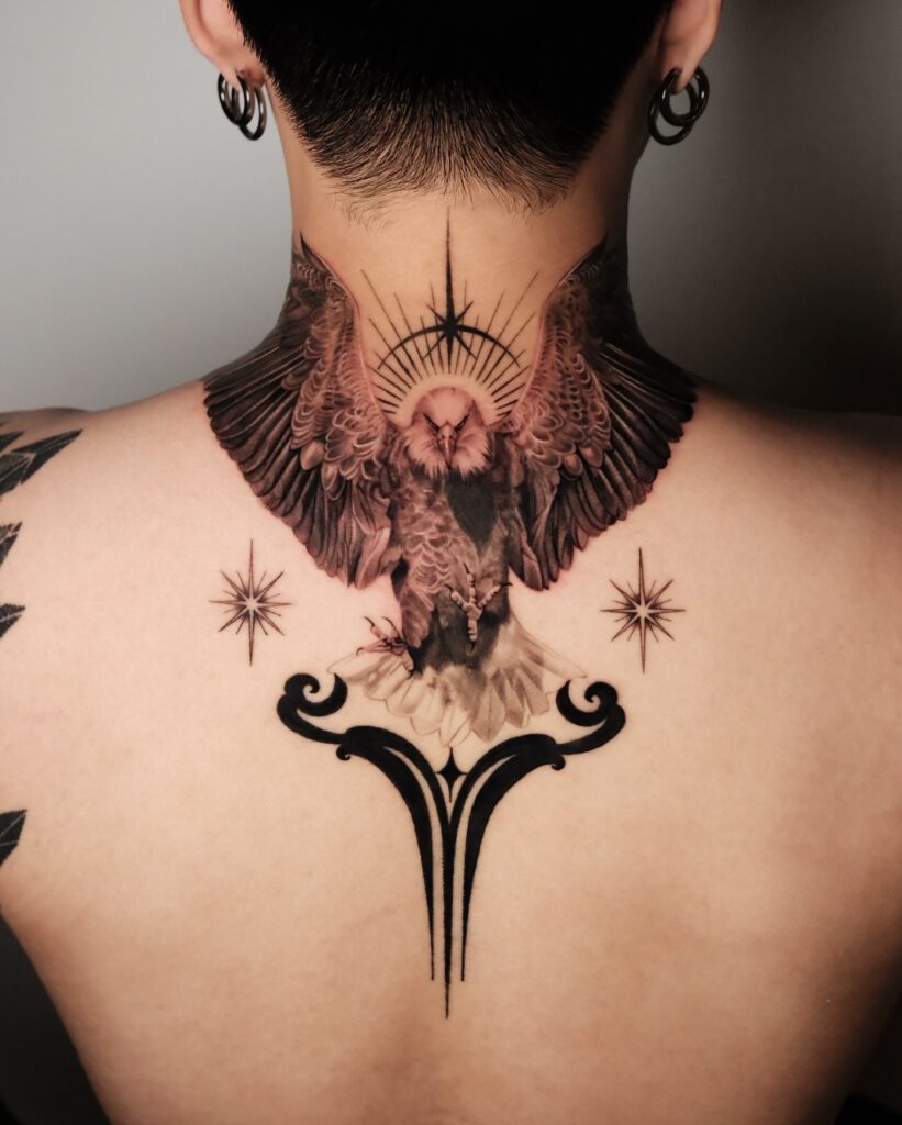 This powerful nape and upper back tattoo showcases a fierce eagle with its wings fully spread, captured mid-flight in stunning detail. Above its head, sharp radiating lines and a central starburst create a sense of divine energy or focused strength.