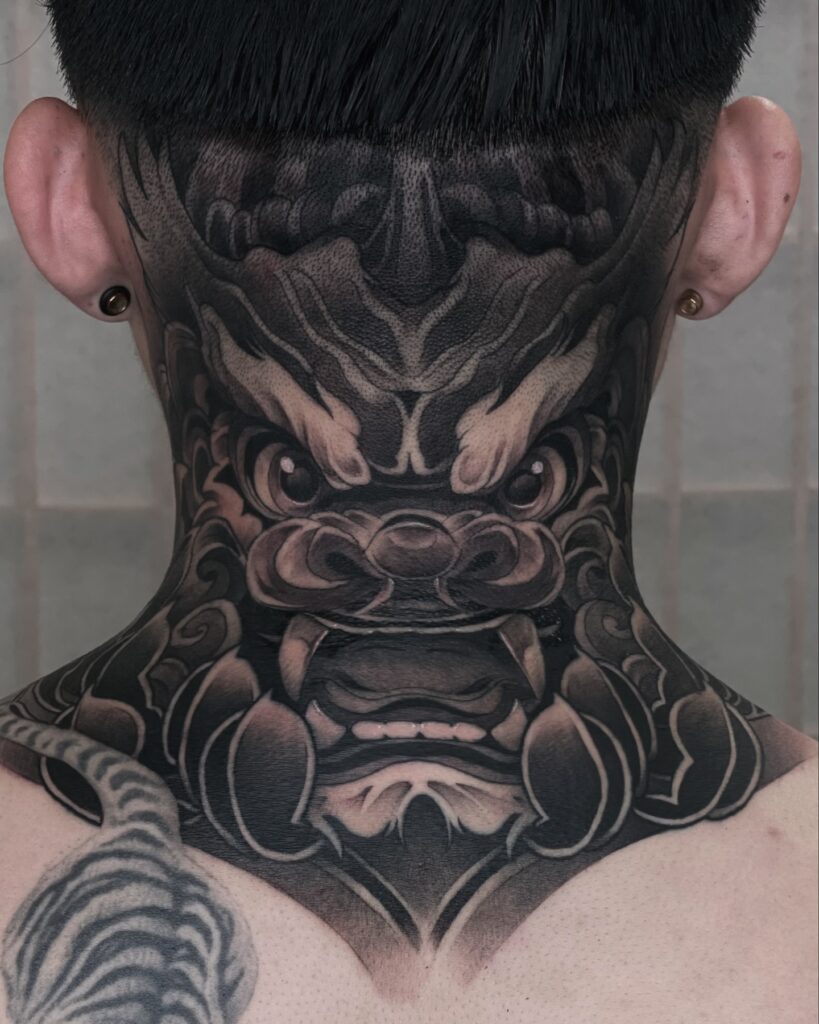 With intense eyes, flared nostrils, and sharp fangs, the creature appears ready to protect and intimidate. Intricate shading and linework give it depth and presence, turning the wearer’s neck into a powerful statement of strength and protection. Rooted in Asian mythology, this tattoo symbolizes courage, loyalty, and the warding off of evil spirits.