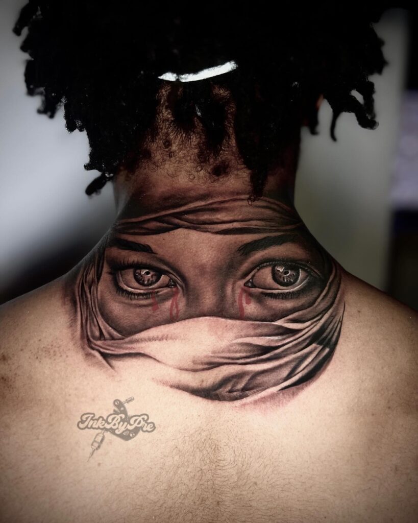 This incredibly realistic neck and upper back tattoo captures a powerful pair of eyes peering out from behind a wrapped veil. The eyes are hyper-detailed, shimmering with light reflections and streaked with red tears, adding emotion and raw intensity to the piece.