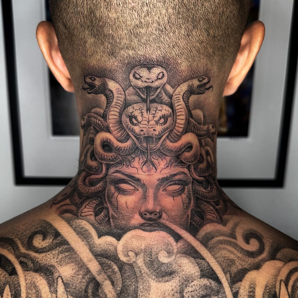 Medusa’s haunting expression and flowing hair give the tattoo a mysterious, powerful presence. Placed high on the back of the neck, this piece is perfect for someone drawn to mythology, transformation, and fierce feminine energy. It commands attention while symbolizing strength, protection, and untamed spirit.