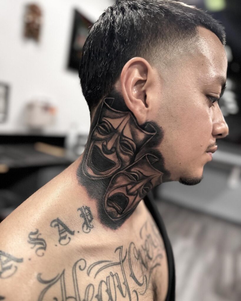 This striking neck tattoo shows a devil-like figure whispering into the man’s ear, creating a powerful visual of inner temptation or dark thoughts. It symbolizes the inner struggle between good and evil, hinting at the constant presence of doubt, mischief, or influence.