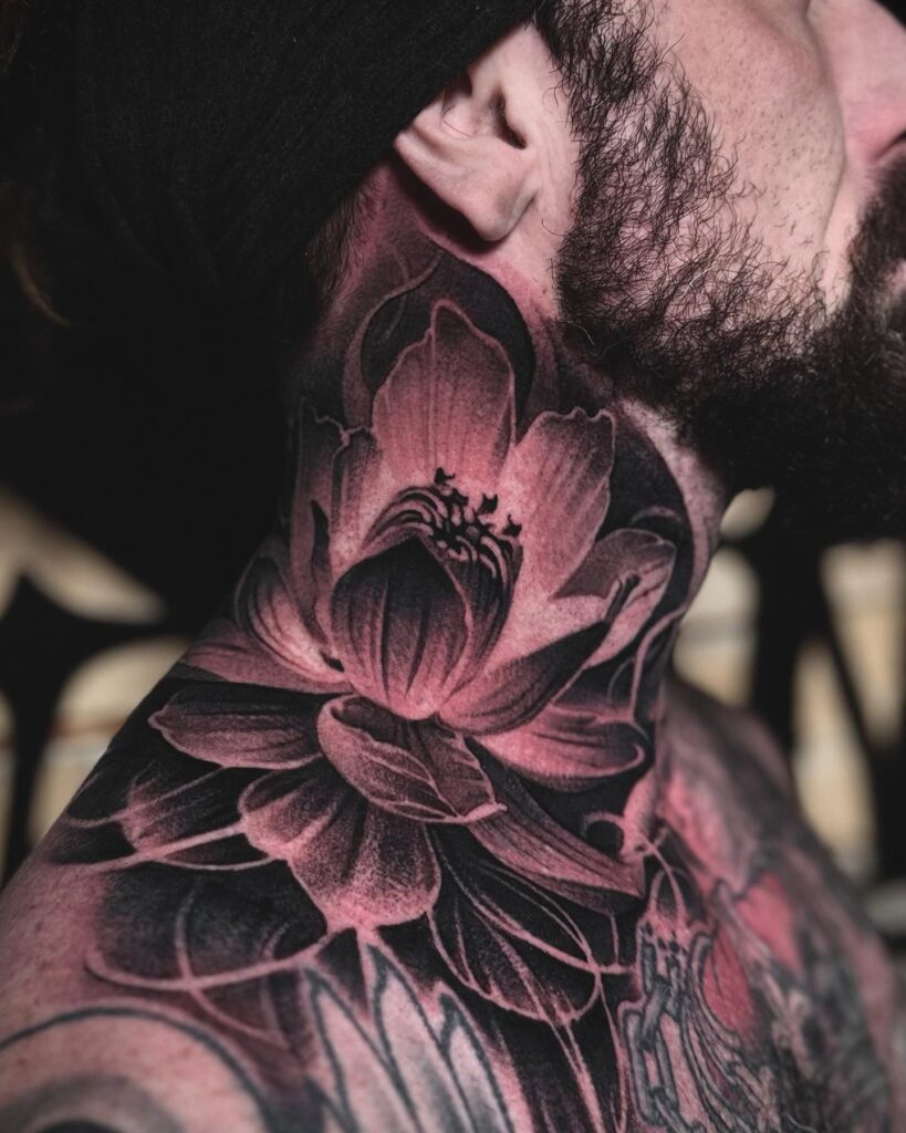 The lotus often symbolizes purity, growth, and spiritual awakening, making it a meaningful choice for those seeking inner peace or resilience. The placement along the neck and jawline adds a powerful edge, blending beauty and strength in one striking design.