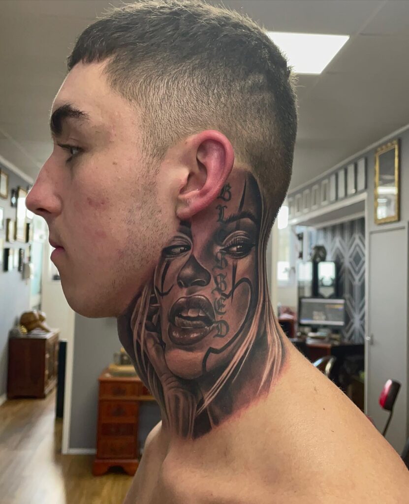 The word “Blessed” is inked vertically over her face in gothic script, blending spiritual meaning with street-style attitude. The deep contrast and smooth gradients give the design a lifelike, almost sculptural quality. It’s a bold, eye-catching piece perfect for someone who embraces intensity, emotion, and unapologetic individuality.