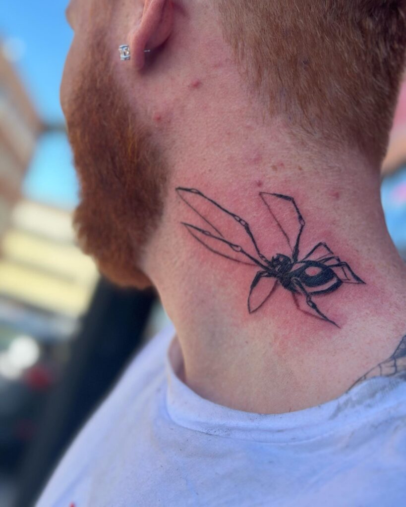 This striking neck tattoo combines a butterfly’s wings with the haunting image of a skull at its center. The butterfly’s wings are detailed and symmetrical, while the skull adds an edgy, gothic twist.