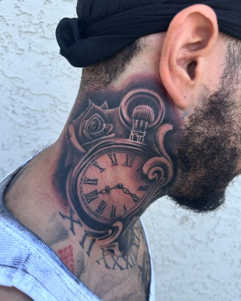 This elegant neck tattoo features a vintage pocket watch surrounded by a shaded rose, blending themes of time and beauty. The Roman numerals on the clock face and the realistic details give it a timeless, classic look.