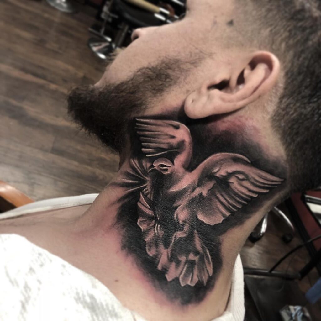 This powerful neck tattoo features a praying angel with detailed wings and a calm, solemn expression. Positioned on the throat and upper chest, the angel’s hands are folded in prayer, symbolizing peace, protection, and spiritual strength.