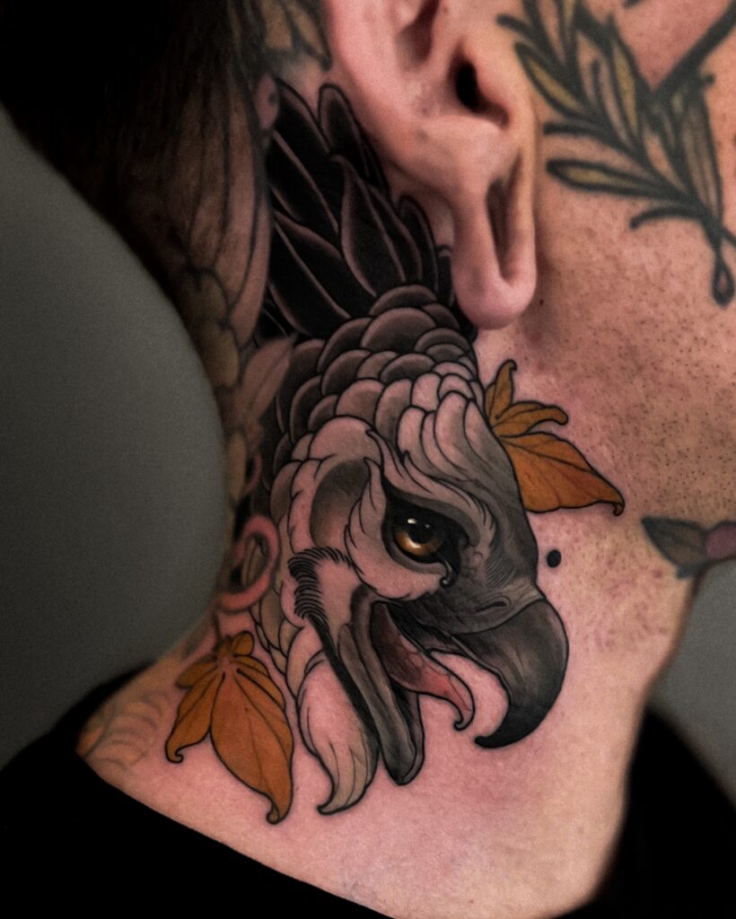 This striking neck tattoo showcases a detailed eagle head with a sharp beak, intense gaze, and bold feather textures. The rich black, grey, and brown tones give it a lifelike appearance, while autumn-colored leaves add warmth and contrast to the design.