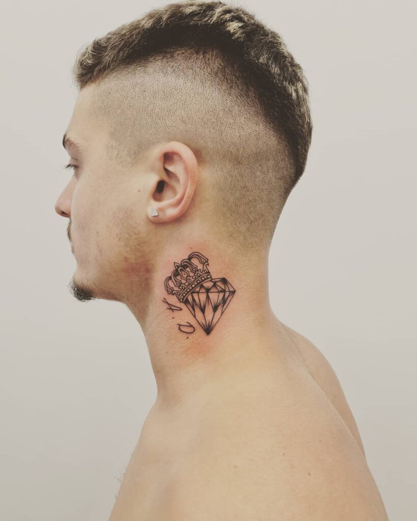 This bold neck tattoo features a beautifully detailed diamond topped with a royal crown, symbolizing strength, value, and authority. The crown elevates the diamond, turning it into a statement of self-worth and ambition.