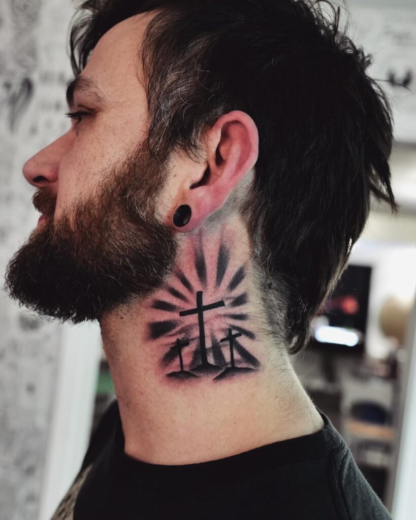 27. Bold Three Crosses Neck Tattoo with Gradient Shadow