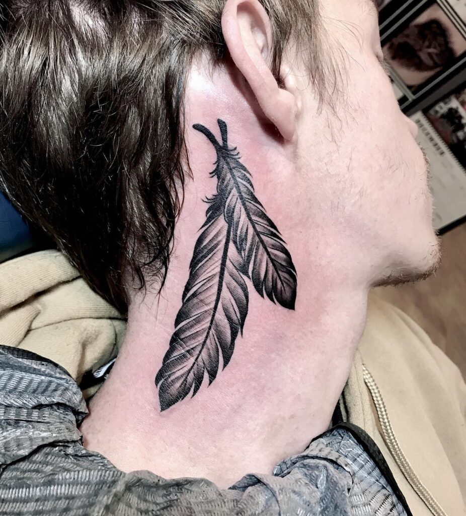 This neck tattoo features two detailed feathers, shaded in black and gray with soft, realistic texture. Feathers often symbolize freedom, spiritual growth, and a deep connection to nature or ancestry.