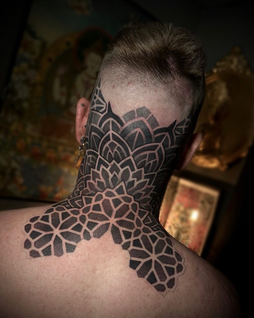 This stunning blackwork tattoo features a large ornamental mandala-style pattern that covers the back of the neck, flows down the spine, and extends upward onto the scalp.