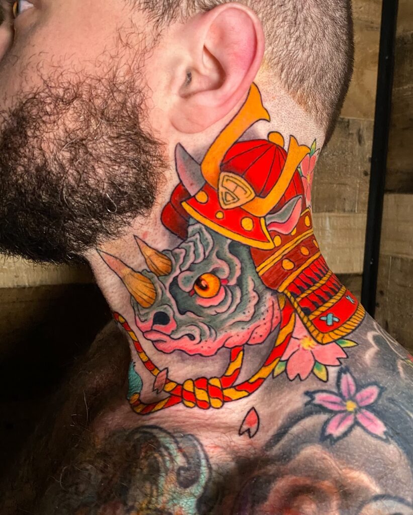 This vibrant neck tattoo showcases a fierce rhino wearing a traditional samurai helmet, blending raw animal power with warrior spirit. The bold colors—fiery reds, golden yellows, and deep greys—make the design pop with intensity and attitude.