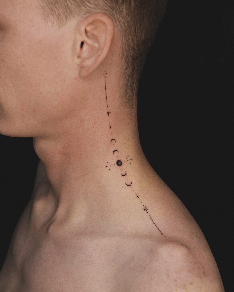 This delicate neck tattoo showcases a vertical line of moon phases, beginning behind the ear and extending to the collarbone. At the center is a bold black circle surrounded by radiant details, representing the full moon or possibly an eclipse.