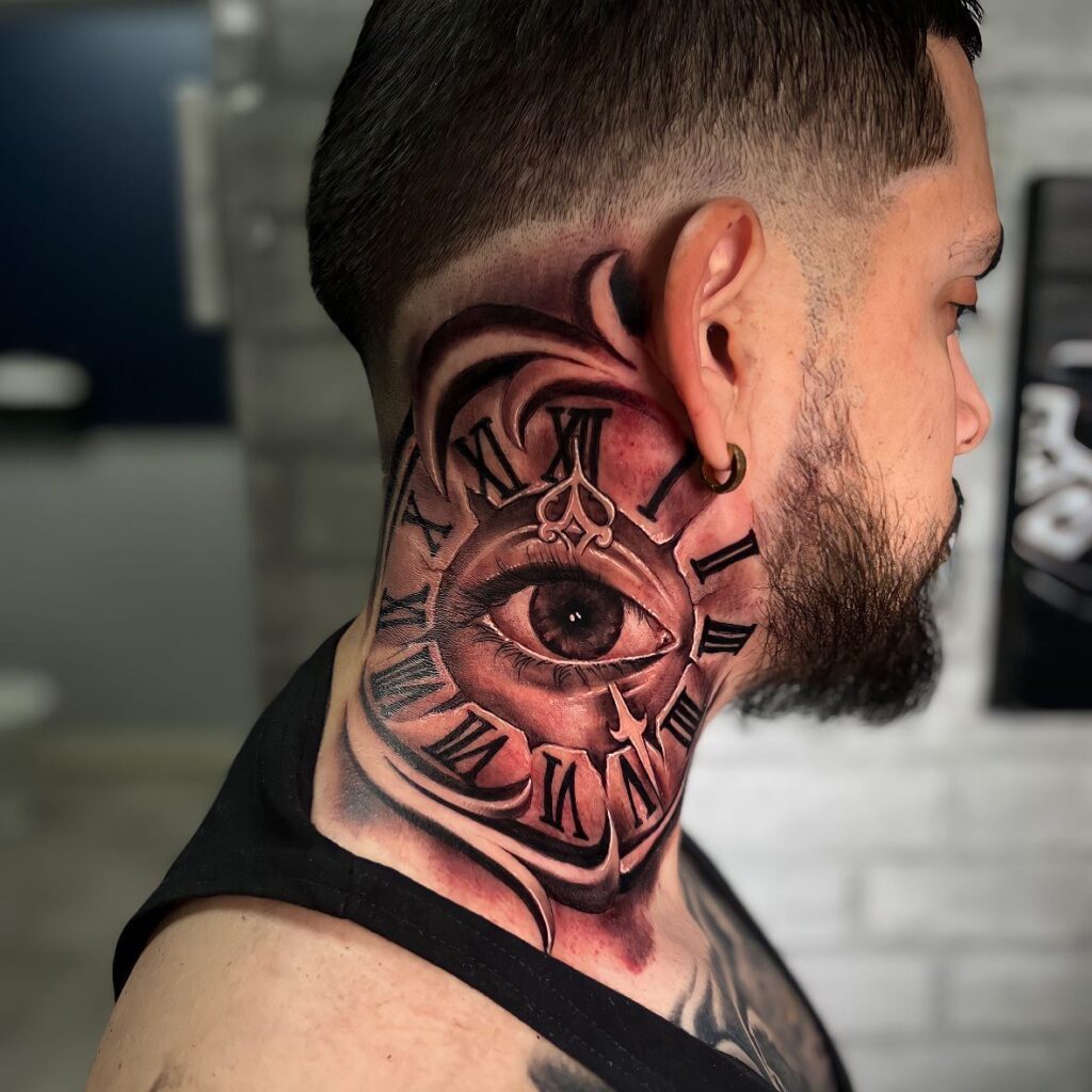 This captivating neck tattoo combines a realistic eye with a vintage clock face, creating a bold fusion of vision and time. The Roman numerals encircle the eye, symbolizing awareness, life’s fleeting moments, and the power of perception.