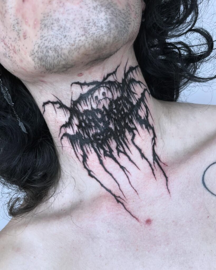 Positioned prominently at the front of the neck, this tattoo blends beauty and darkness, making it perfect for someone who embraces transformation with a fearless attitude.