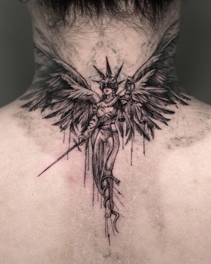 This detailed back-of-neck tattoo features a powerful winged depiction of Lady Justice, holding her iconic scales and sword. Blindfolded and crowned, she floats with grace and authority, symbolizing fairness, balance, and truth.