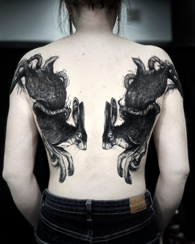 Dynamic Twin Hare Back Tattoo