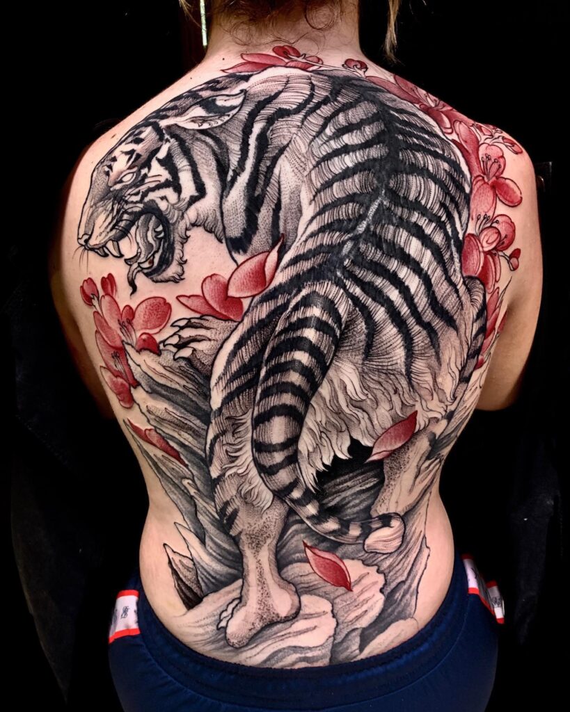 Ferocious Tiger Back Tattoo with Red Blossoms