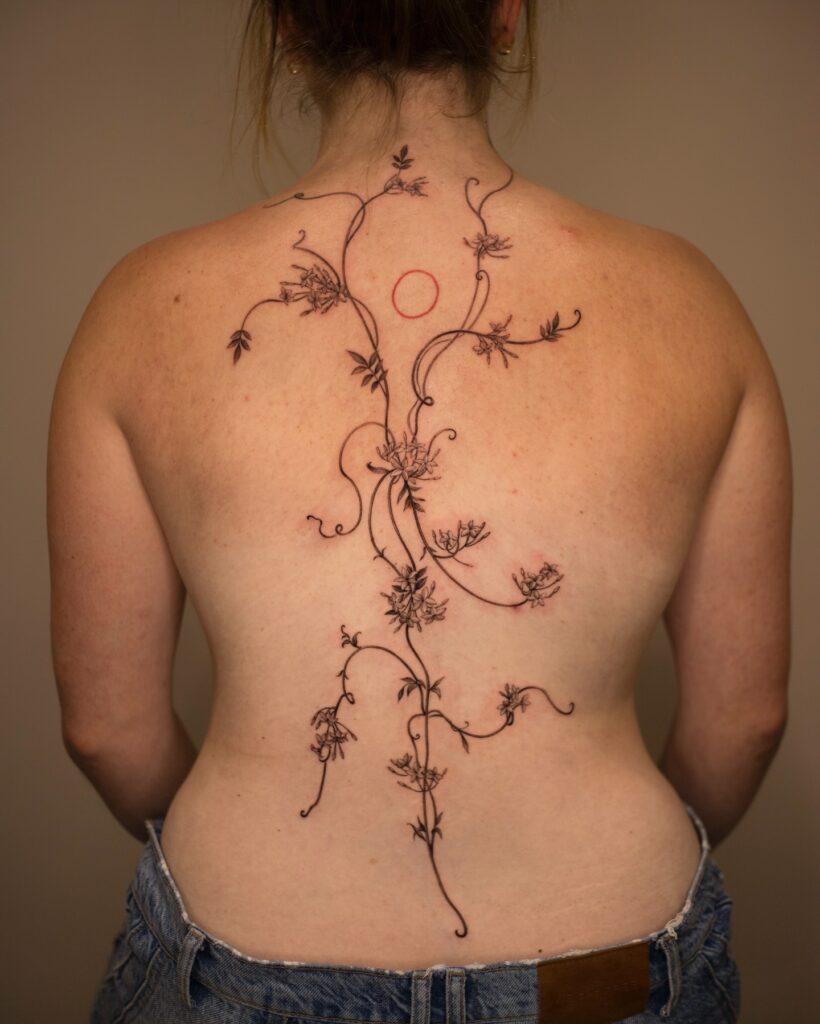 This graceful tattoo features delicate jasmine blossoms and trailing vines running elegantly down the spine.