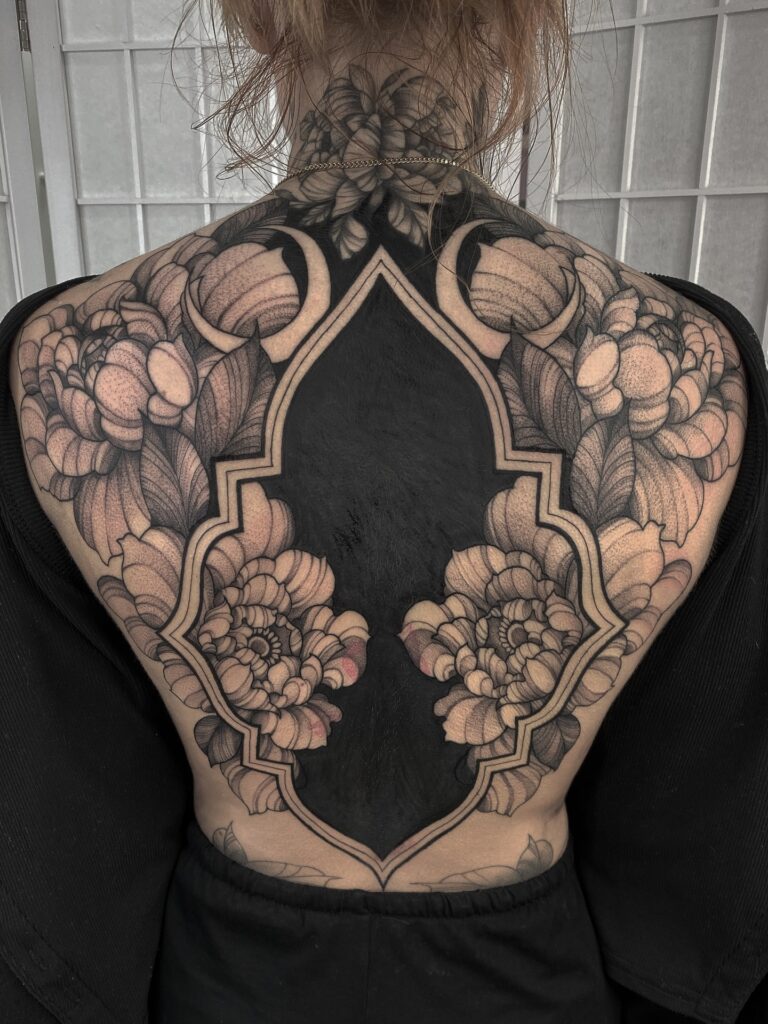 This dramatic tattoo combines deep blackwork with soft floral shading, creating a striking contrast across the entire back.