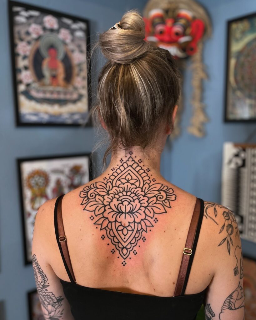 The precise symmetry and careful detailing highlight the artist’s skill while complementing natural body contours. Positioned between the shoulders, this mandala makes a captivating statement while maintaining timeless elegance and a sense of calm strength.