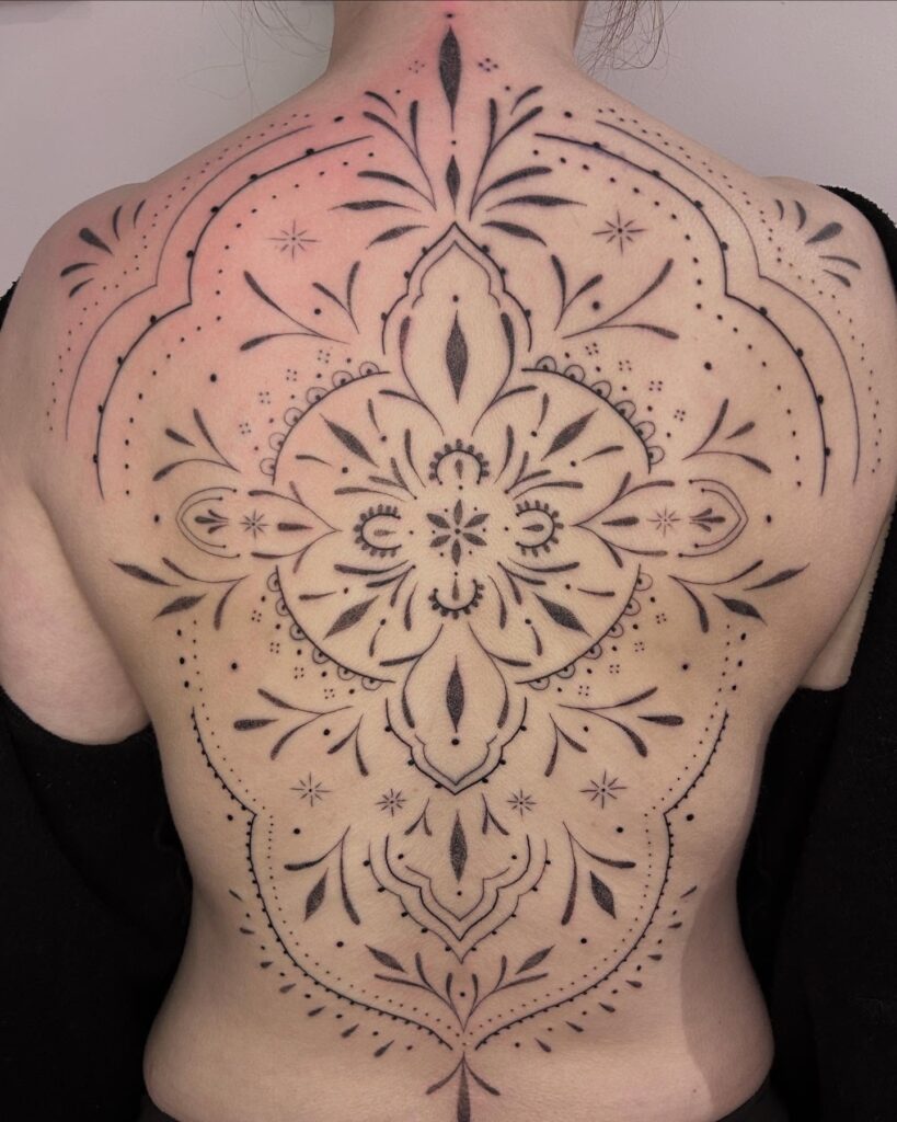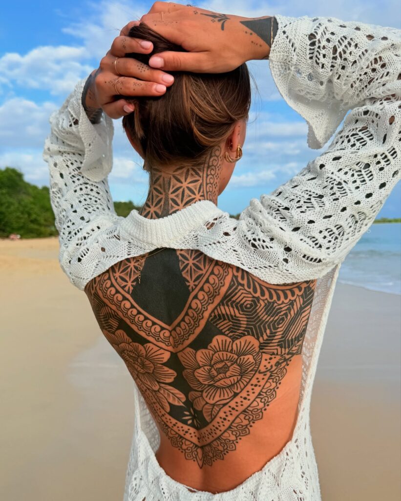 Extending from the neck to the lower back, the tattoo enhances natural curves while creating a dramatic, sacred geometry-inspired statement. It’s a perfect fusion of bold blackwork and delicate ornamental artistry.