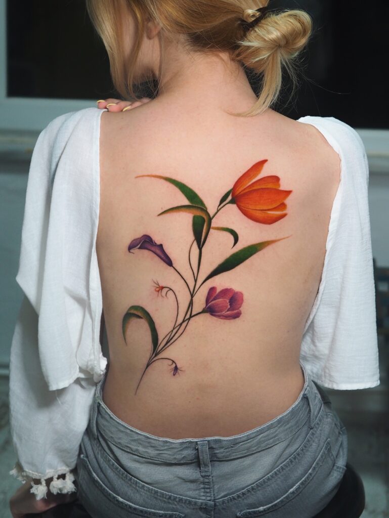 The bright, painterly colors create a striking contrast, making each flower appear fresh and lifelike. The graceful vertical composition follows the spine naturally, enhancing the body’s shape while remaining feminine and refined.