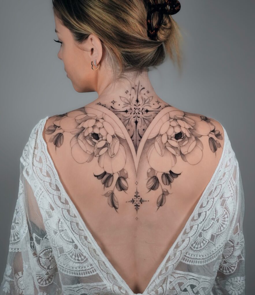 Delicately shaded flowers spread across the shoulders, while symmetrical ornamental lines flow downward, creating a heart-like frame. Fine dotwork at the center adds texture and dimension, enhancing the tattoo’s refined appearance.
