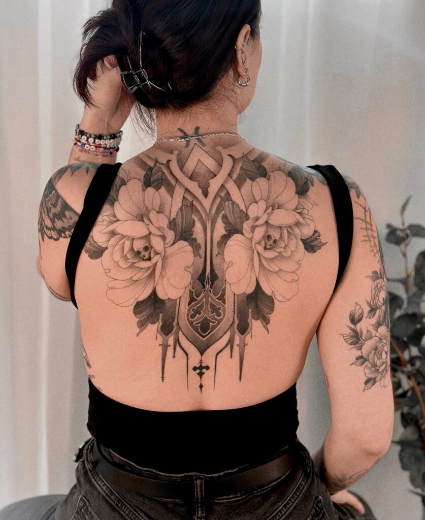 Gothic Floral Back Tattoo with Ornamental Detailing