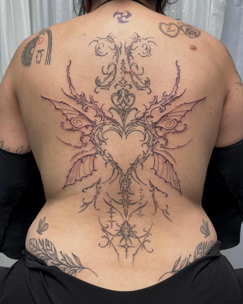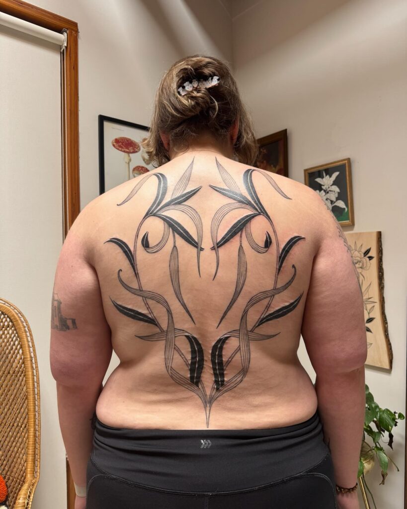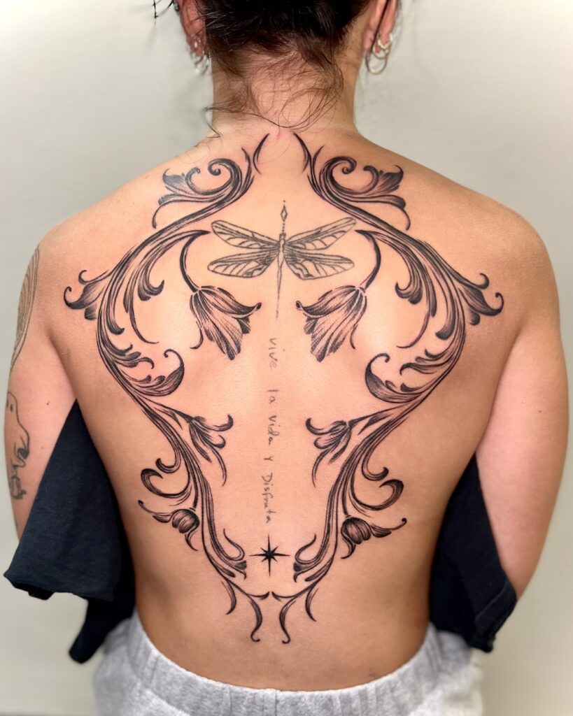 The intricate blackwork mimics wrought iron patterns, giving the piece an architectural elegance that stands out dramatically against the skin. Flowing from the shoulders down the spine, the design highlights the body’s natural shape with perfect balance.