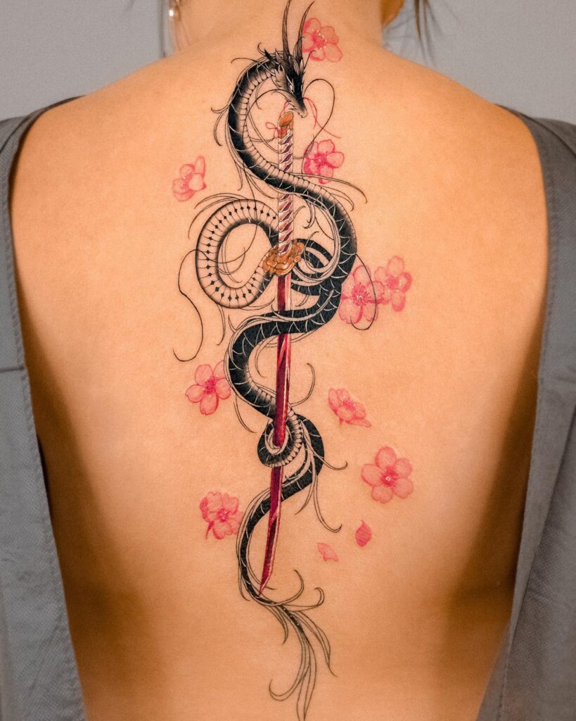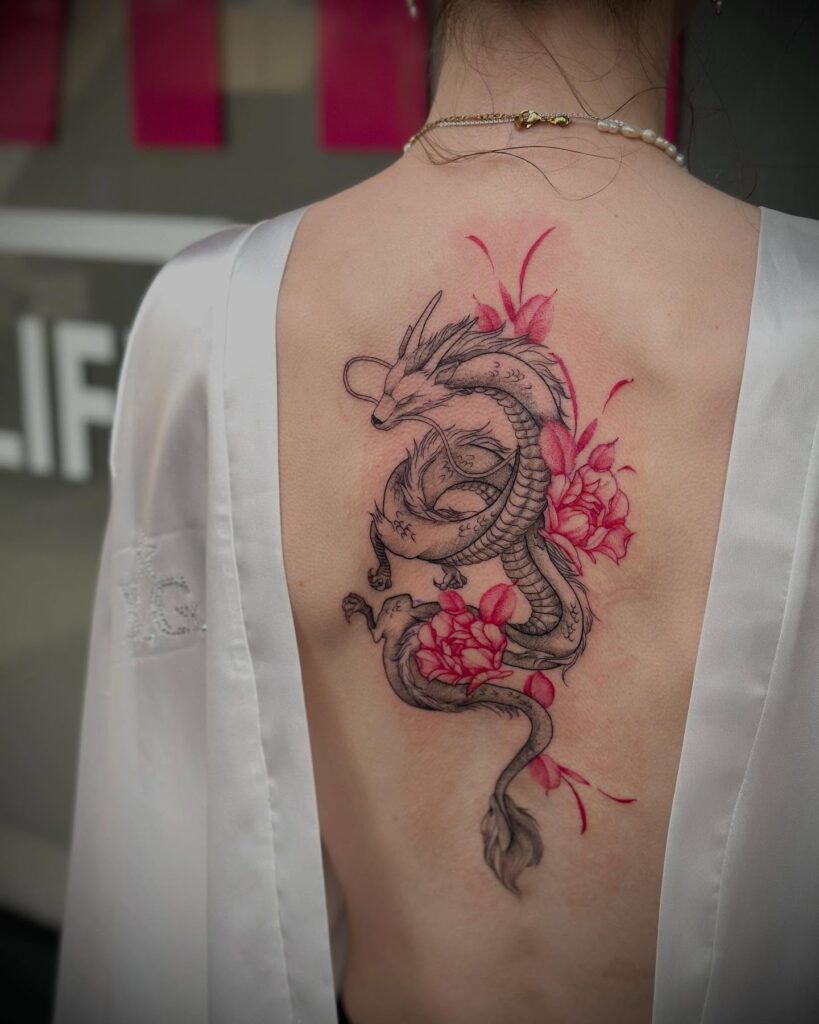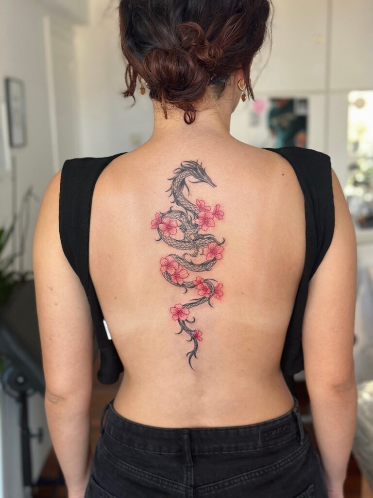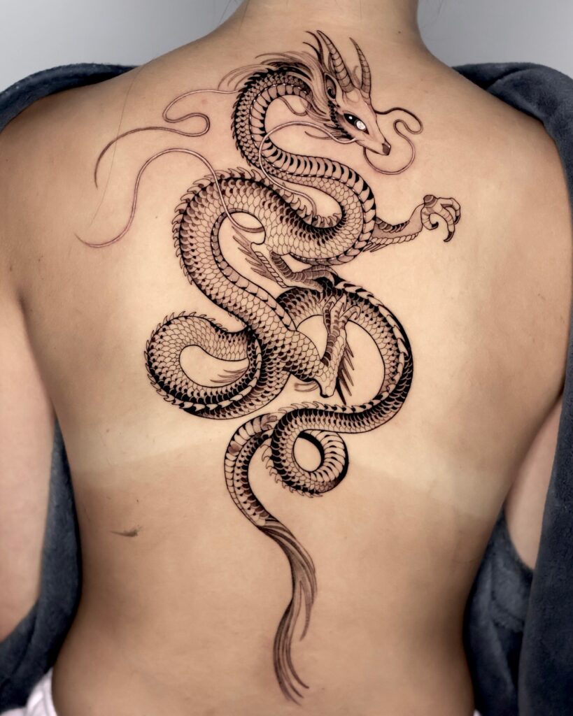 Dragons often represent wisdom, protection, and resilience, making this tattoo both symbolic and visually striking. Positioned along the spine, the composition flows naturally with the body, emphasizing movement and creating a commanding yet graceful presence.