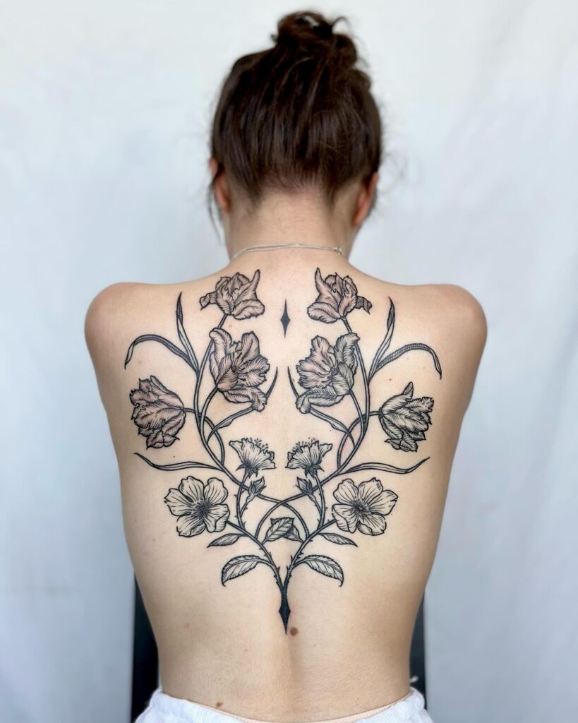 The placement enhances body flow, with vertical stems drawing attention to the spine and balance of form. Covering the entire back, this piece creates an impressive floral statement that feels bold yet beautifully refined.
