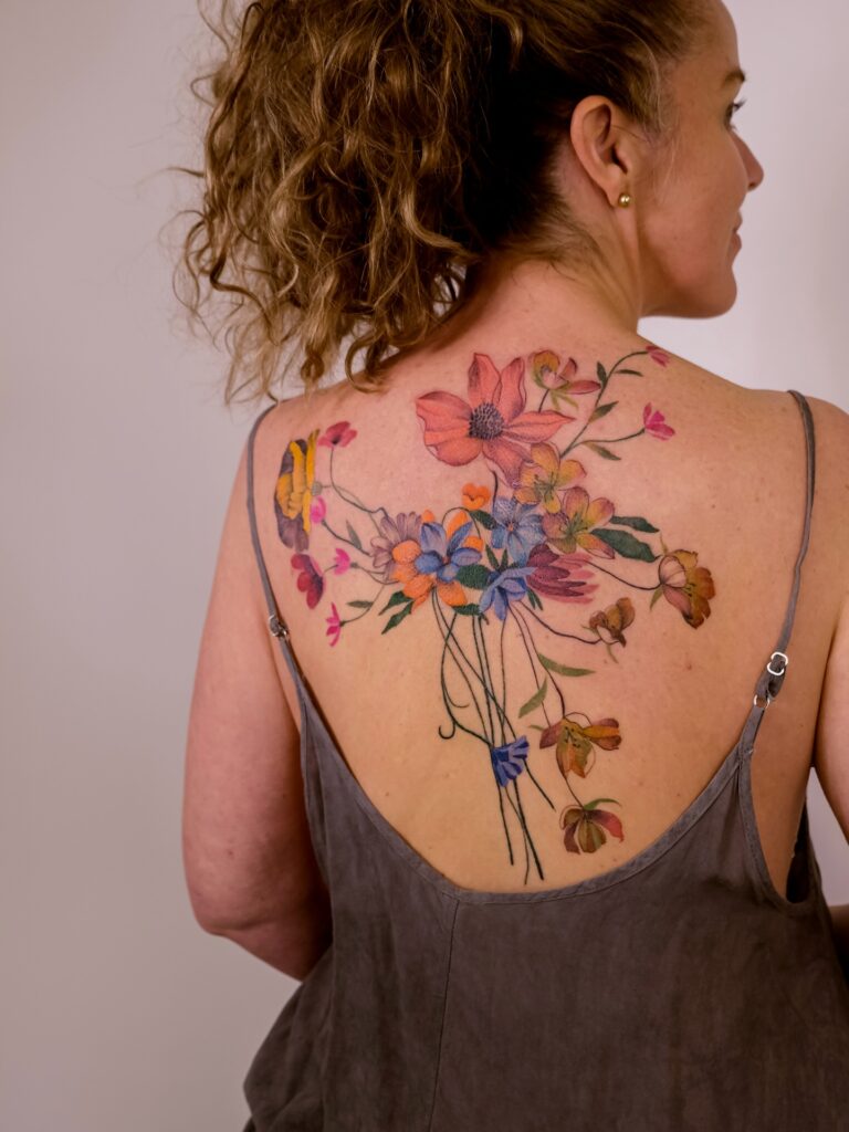 The arrangement follows the body’s natural curves, creating graceful movement from shoulder to waist. This large-scale piece blends traditional floral artistry with modern watercolor techniques, resulting in an elegant tattoo that feels vibrant, balanced, and full of life.