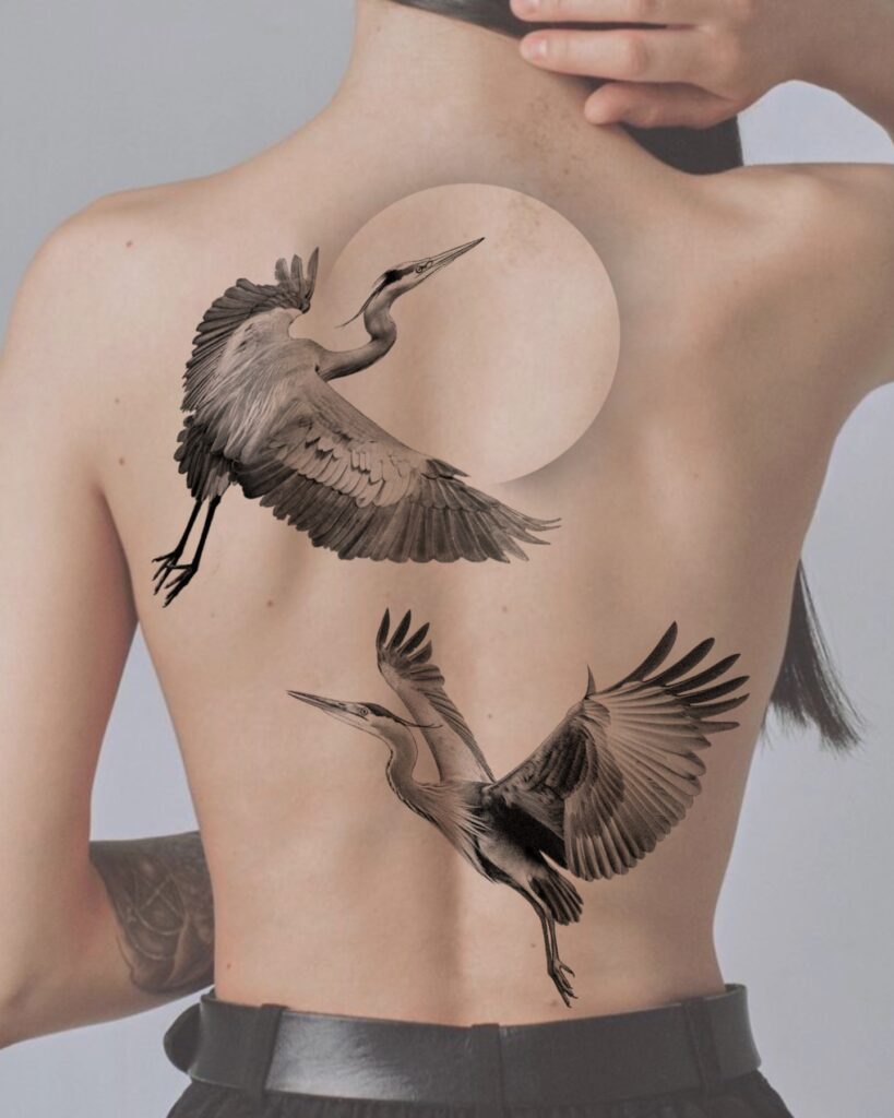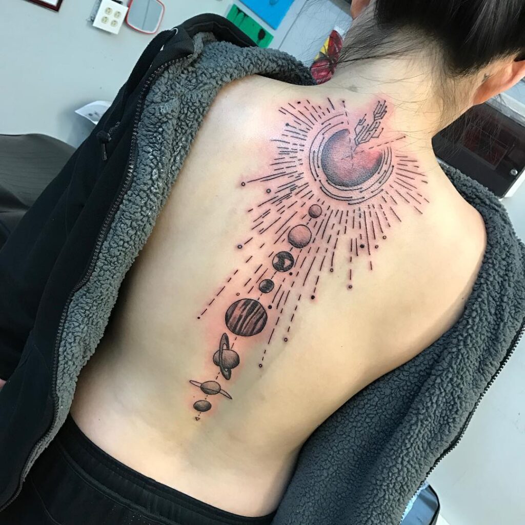 Fine, precise linework blends realism with geometric art, giving the piece a modern, otherworldly feel. Positioned along the spine, this tattoo captures both spiritual elevation and the balance of mind, heart, and cosmic connection.