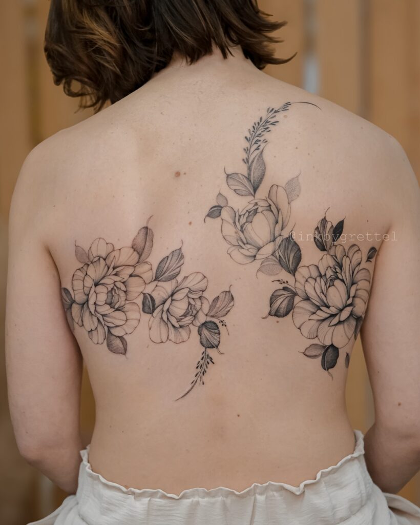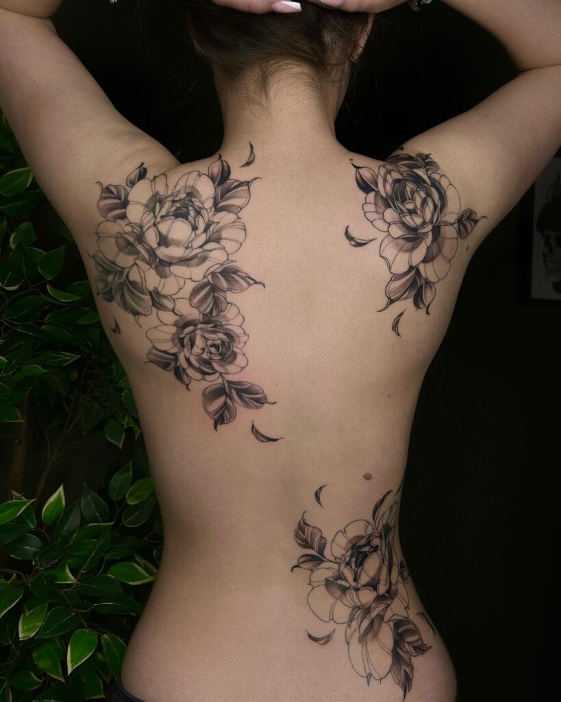 This graceful tattoo features soft black and grey peonies cascading across the back and waist. The delicate petals and scattered leaves create a natural movement that feels both romantic and free.