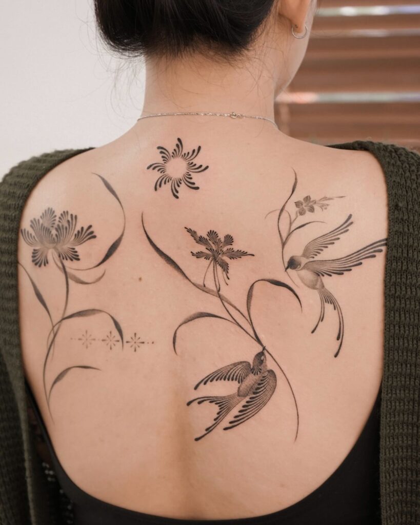 Shading and dotwork give depth, making each element stand out while flowing seamlessly across the shoulders. Ideal for someone who loves both ornamental and botanical art, this design enhances the back’s natural shape while reflecting a peaceful and creative spirit.