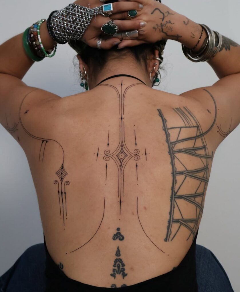 Slim symmetrical strokes, tiny dots, and diamond-shaped details create a graceful, architectural feel. The design highlights the body’s natural curves, drawing attention to the spine while adding visual balance across the back.