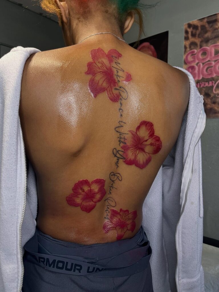 This lively back tattoo highlights bold red hibiscus flowers arranged along the spine for a striking, natural flow.